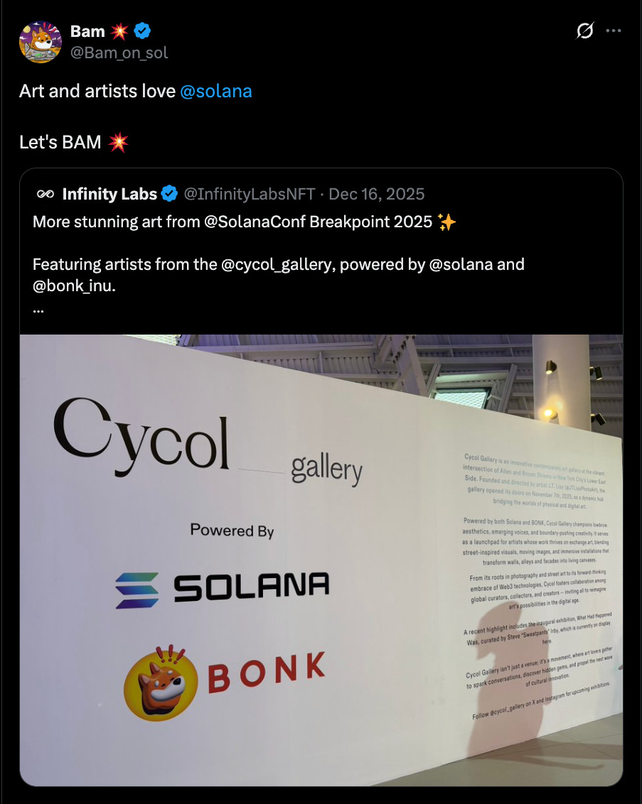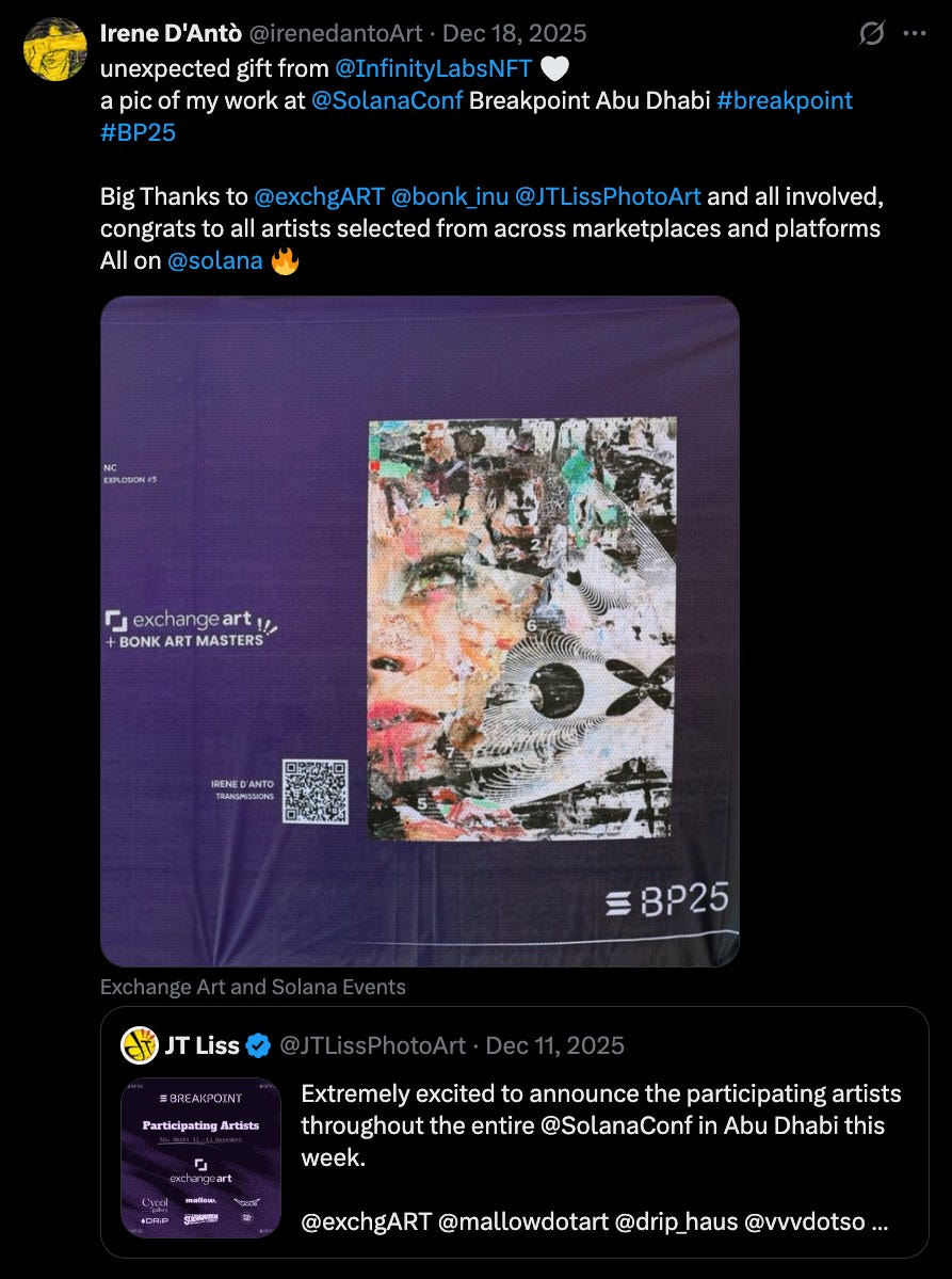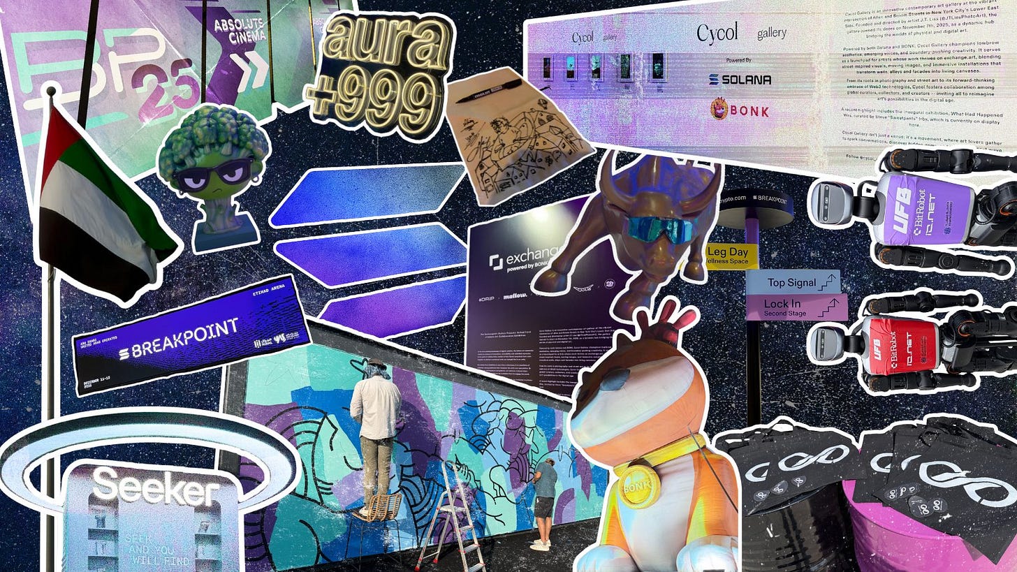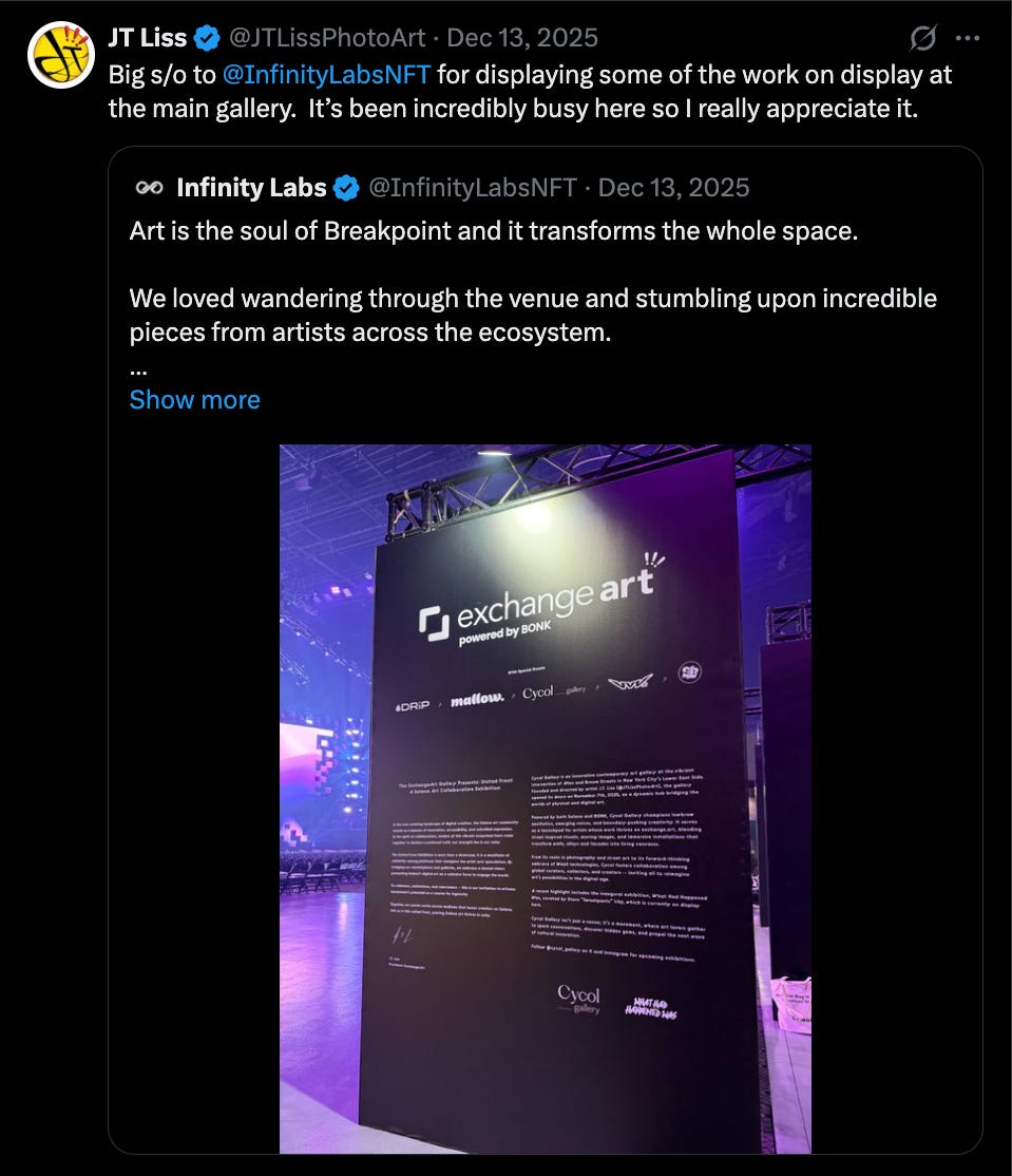 One of the most exciting parts of Breakpoint is meeting builders and seeing projects in person. This year was also a fantastic season for artists in the ecosystem. The arena showcased stunning pieces from over 60 talented Solana artists, and we were honored to bring these works to the community.