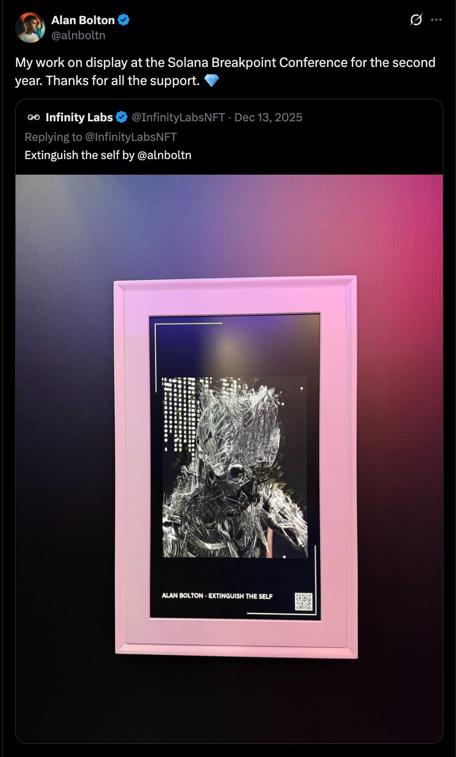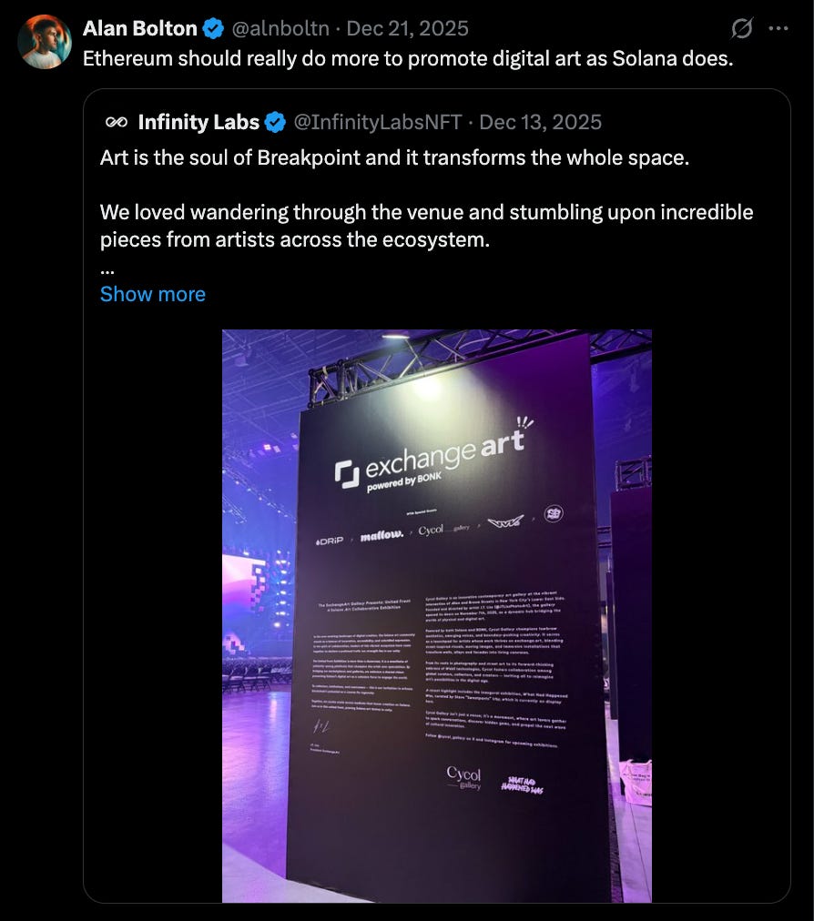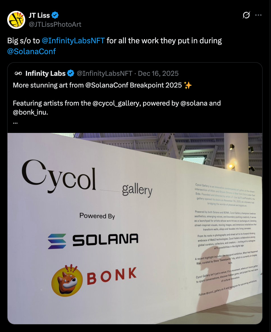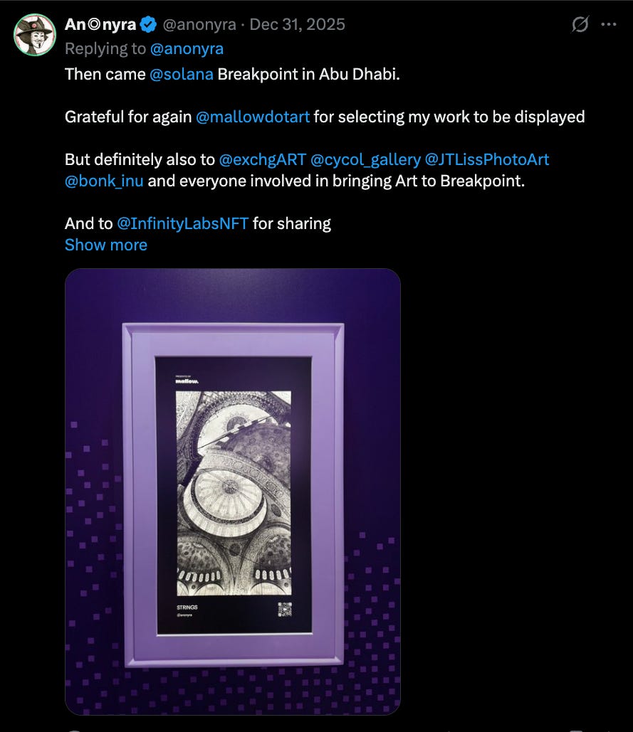 One of the most exciting parts of Breakpoint is meeting builders and seeing projects in person. This year was also a fantastic season for artists in the ecosystem. The arena showcased stunning pieces from over 60 talented Solana artists, and we were honored to bring these works to the community.