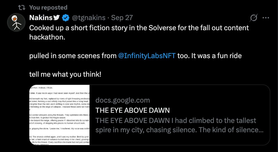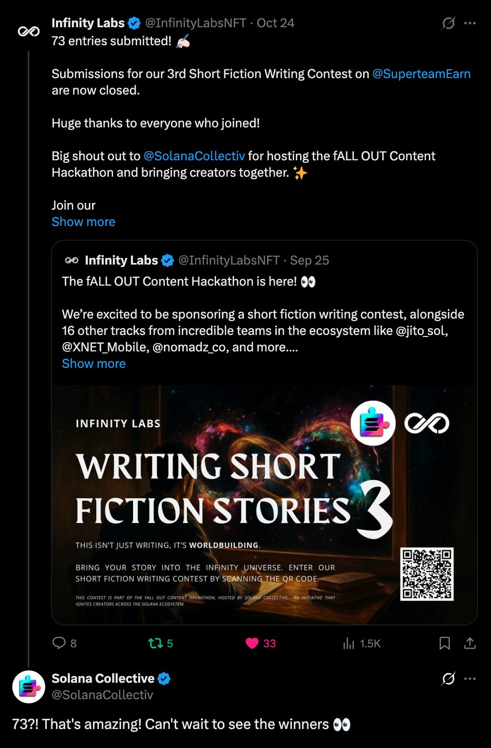 Infinity Labs has concluded its 3rd Short Fiction Writing Contest, held as part of the Solana Collective’s last hackathon of the year, fALL OUT Content Hackathon.